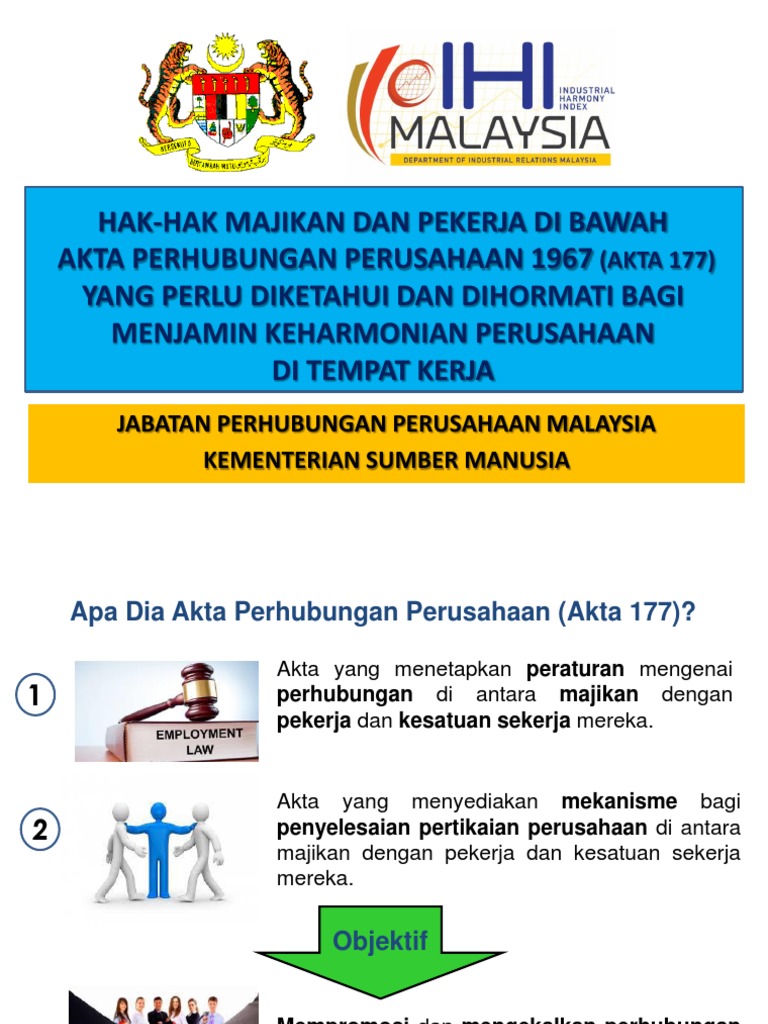 Ia juga memberikan kuasa kepada kerajaan untuk menghukum sesiapa yang menyertai mogok haram. Tujuan akta ini diwujudkan adalah untuk menetapkan dengan cara yang teratur perhubungan antara majikan dan pekerja serta kesatuan sekerja mereka. Akta perhubungan perusahaan 1967 ('ira') objektif: Akta perhubungan perusahaan 1967 (adakala disebut 'perindustrian') atau dalam bahasa inggerisnya, industrial relations act 1967 adalah suatu perundangan penting yang sering digunapakai namun tidak disedari ramai. Pindaan akta perhubungan perusahaan mtuc menteri dan kelas pekerja sosialis.