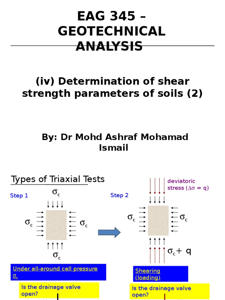N different strengths will be measured for a given soil that (a) deforms at constant volume (undrained) and (b) deforms without developing excess pore pressures (drained). Such programs usually include the use of modern numerical modeling techniques such as finite element analysis coupled with a model for shear strength such as critical state soil mechanics. It is needed to derive the bearing capacity, design retaining walls, evaluate the stability of slopes and embankments, etc. Drained shear strength of a soil is the shear strength w.r.t. Shear strength is a critical parameter in geotechnical projects. The direct shear test 2. And also to know the strength of peaks or mountains having slopy or steepy regions. The shear strength of soil is usually determined experimentally by one of the following methods. 2.2 shear strength of soils shear strength of soils play a significant role in geotechnical engineering, especially in slope stability analysis. Shear strength of soil prof. This technical note is intended to provide a basis for estimating a soil's unit weight in the absence of. The shear strength parameters (c, ɸ) are determined under definite test conditions. 11 shearstrength of soil the shear strengthof a soil massis the internal resistanceper unit area that the soil masscan otterto resistfailure and sliding (11.6a) a o'i ef1'ectivenormal stress figure 71.3 mohr'scircleand failure envelope 314 chapter 11 shear strength of soil also, r aa: